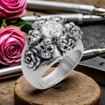 The Ladies Roses & Skulls CZ Ring, made from Stainless Steel, Boasts a Striking Rosette Design with a Sparkling 1ct clear CZ at its Heart. Delicate Roses Adorn each side, while Six Skulls Encircle the Centerpiece, Creating a Bold and Eye-Catching Statement.
